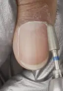 Turn the finger and pull back the lateral fold, guiding the bit down the sidewall of the nail. Repeat 2-3 times, removing dust to check for any remaining cuticle. Repeat on all nails.